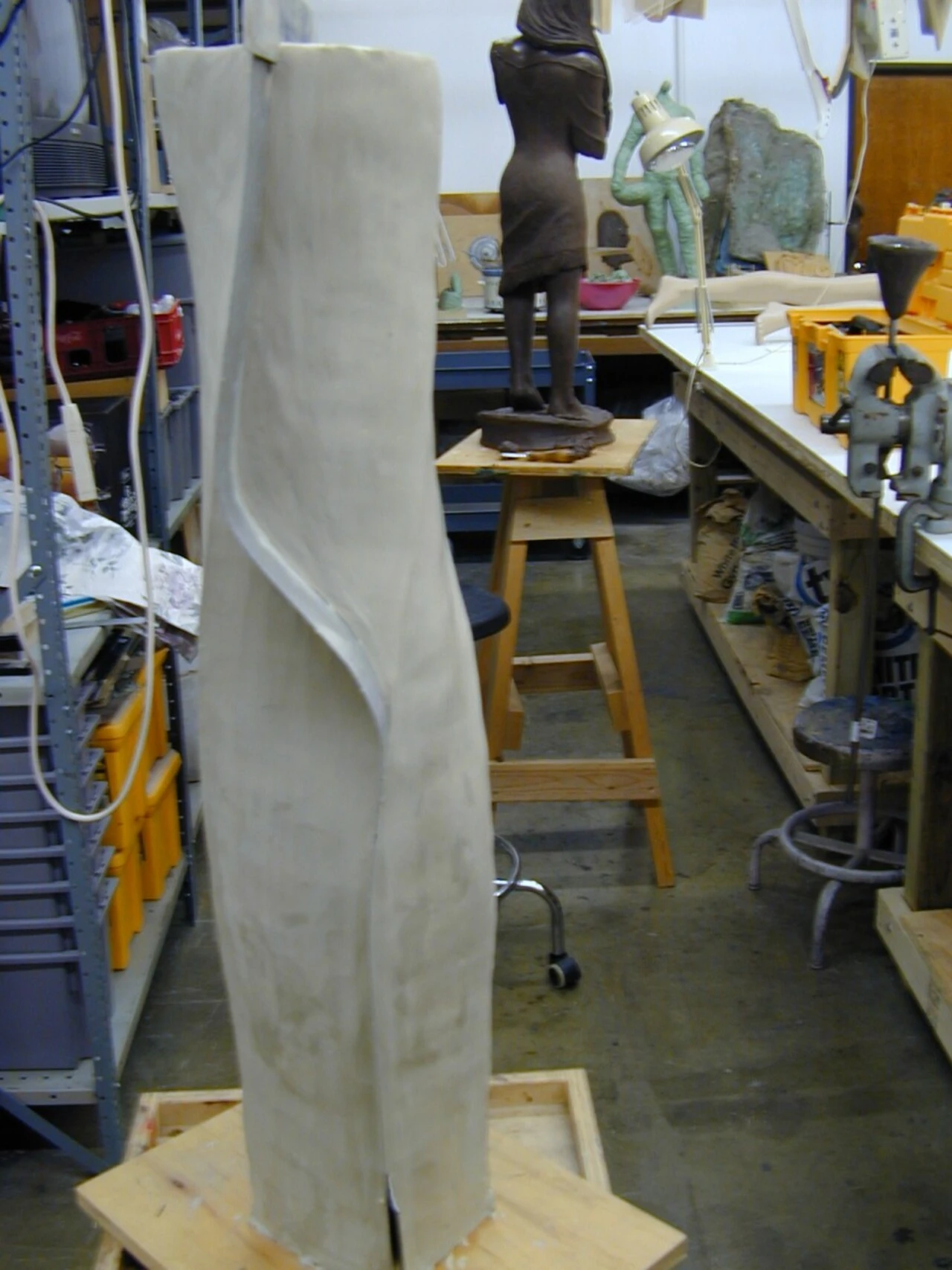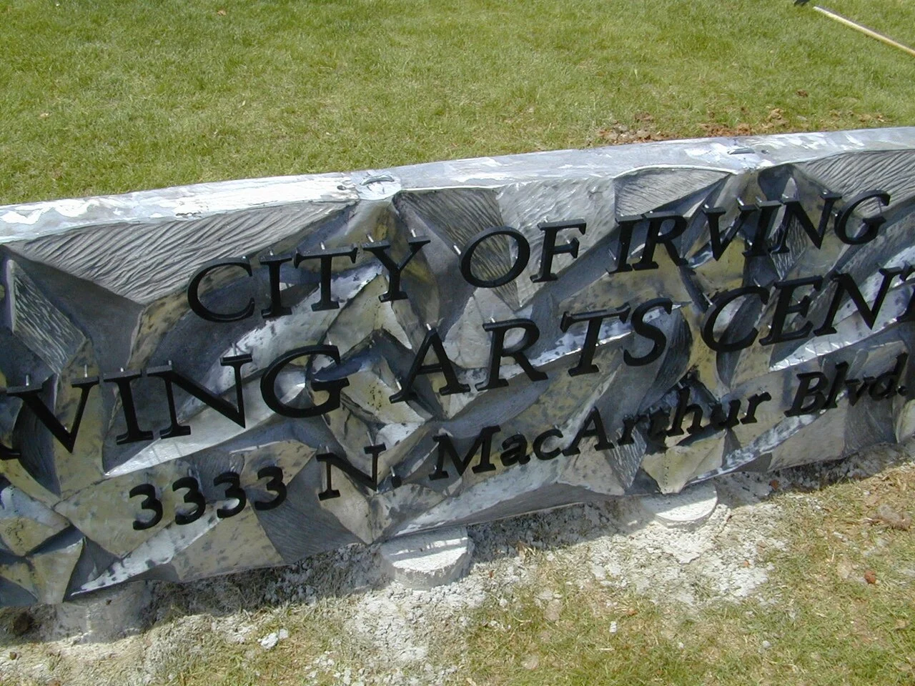 Sculpting the original design, panels were sand-casted in solid 3" thick slabs, welded together, and used as a backdrop for lettering.